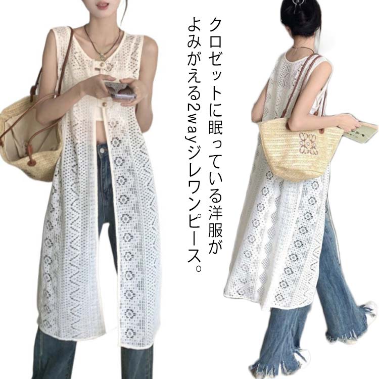 前後2way レイヤード ベスト ワードローブに加えたい花レースジレ 羽織り ノースリーブ ワンピース 重ね着 きれいめ ロングベスト