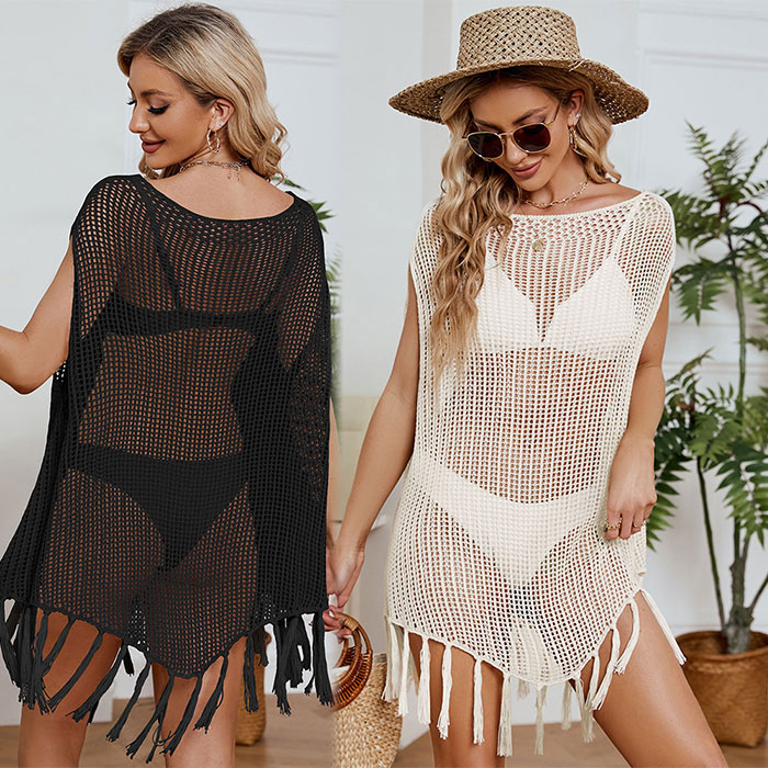 ワンピース クロシェ編み レディース オールインワン 透け 水着の上に 可愛い ワンピース 水着 日焼け防止 体型隠し ゆったり 夏 海 裾フリンジ ライン綺麗 ブラック ベージュ