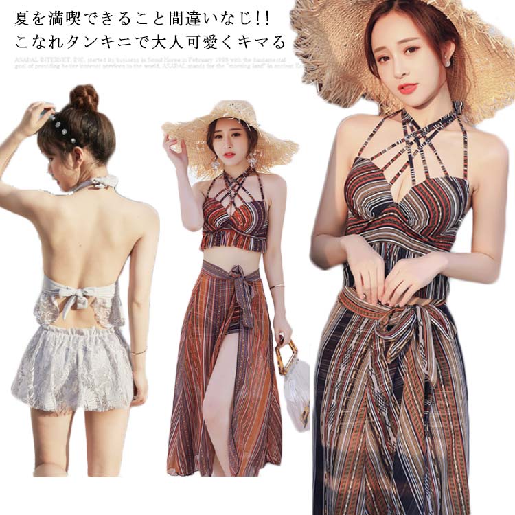 水着 レディース ママ水着 タンキニ水着 ビキニ パレオ付き 3点セット バックシャン ボタニカルレディースファッション 水着