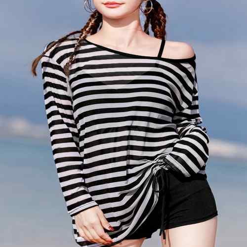 レースアップビキニ レディース ハイウエストショートパンツ ボーダーラッシュガード 水着セット 日焼け防止 着やせ 体型カバー水着 夏海リゾート海水浴 韓国風スイムウエア