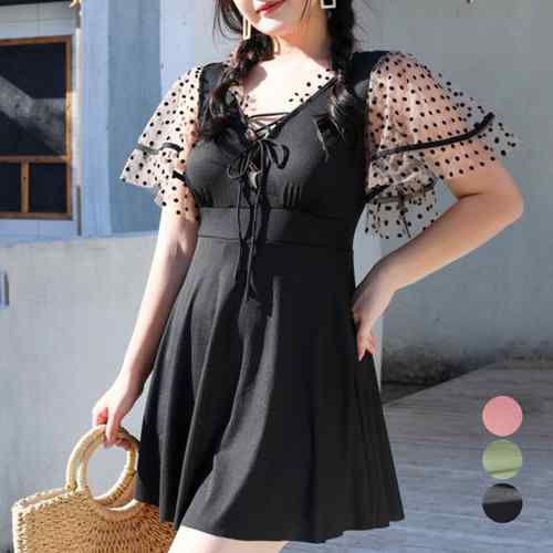レディース 大きいサイズ 可愛い オールインワン水着 韓国風フレアワンピース スイムウェア ハイウエスト ママ水着 半袖 レースアップ 水着 露出控え目水着夏海 お洒落 水着着やせ