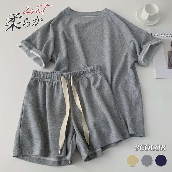 楽ちん~ 半袖tシャツ ショートパンツ 上下セット Set up 春 夏 イエロー ネイビー グレー M L XL 大きいサイズ ♪