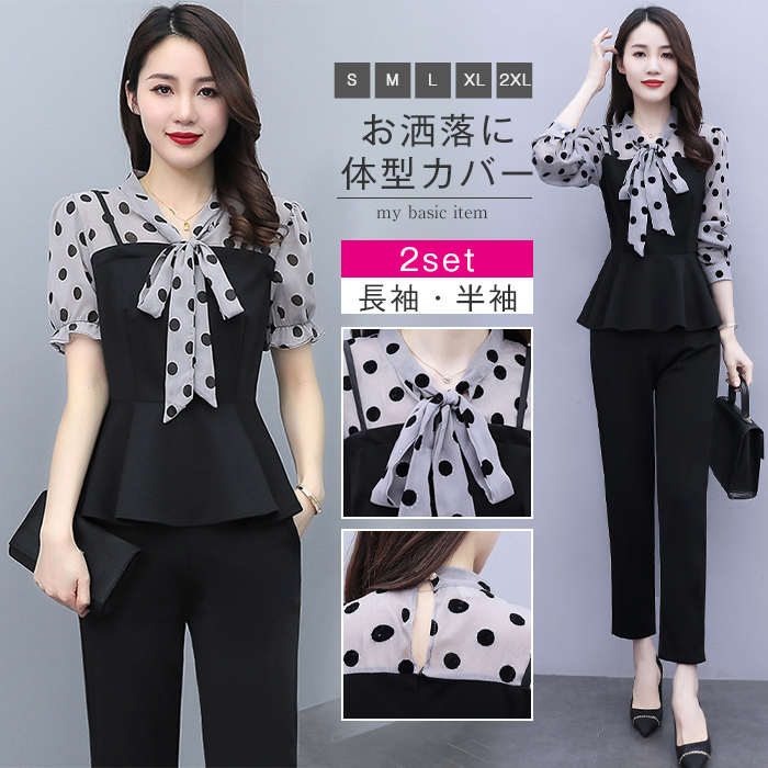 セットアップ レディース セレモニー 長袖 半袖 結婚式 卒業式 入園式 入学式 大きいサイズ 体型カバー 2点セット 上下セット リボン きれいめ 着痩せ お洒落 二次会 パーティー 披露宴 通勤
