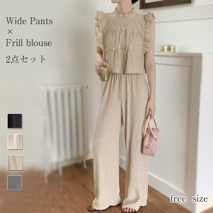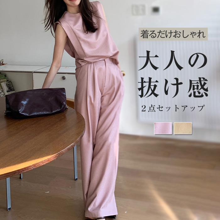 夏らしいベーシックなノースリーブ&パンツSET 使いやすい幅のワイドパンツはデイリーユースに活躍してくれる