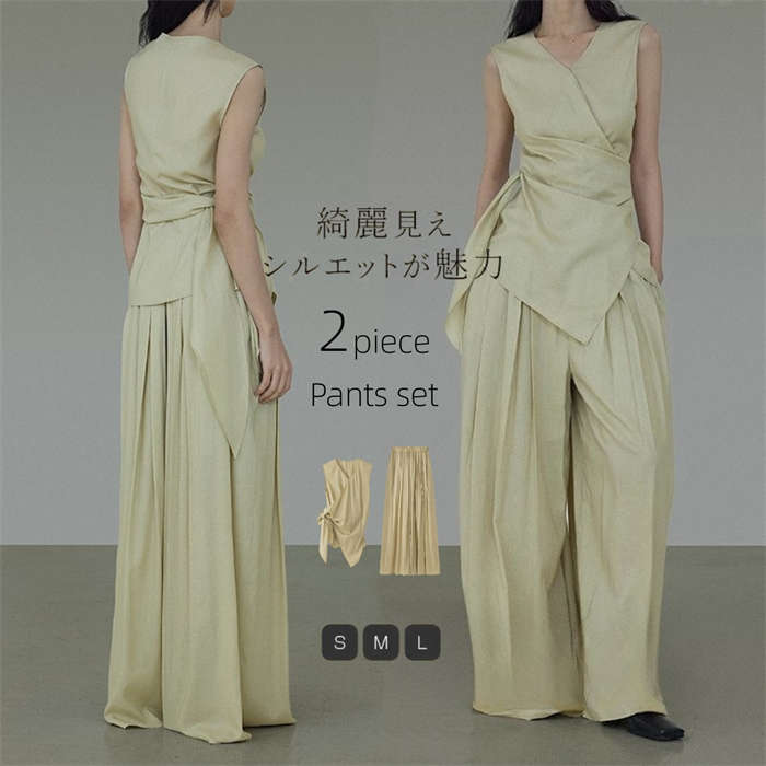着るだけお洒落~ Vネック ベスト スカート風 ワイドパンツ 2点セット 春夏 S M L 大きいサイズ かわいい 大人 上品 パーティー 二次会 お呼ばれ 女子会 お食事会 結婚式 ♪