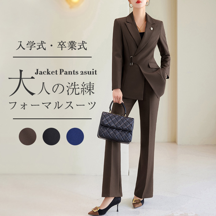 選べる スタンダードカラージャケット ワイドスーツパンツ 2点セット Pants Suit 春 秋 ブラウン S M L 通勤 お宮参り 二次会 パーティー お呼ばれ 女子会 お食事会 結婚式 ♪