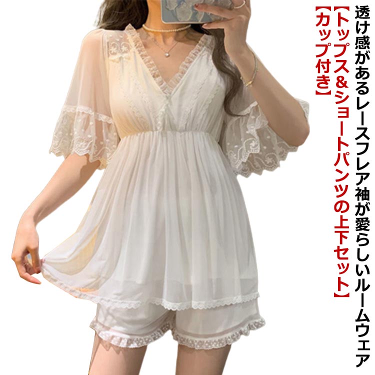 ルームウェア 上下 大人 シースルー 透け感 フリル 半袖 5分袖 ショートパンツ ハーフパンツ かわいい