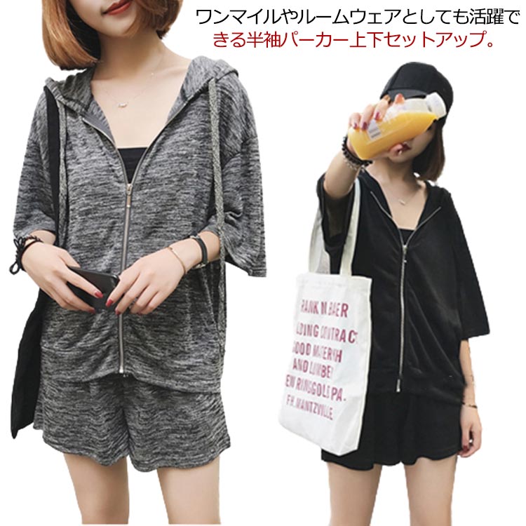 ゆったり着られて細魅せ♪ ジャージセットアップ 短パン スウェットセット 半袖 パーカー ルームウェア 春夏