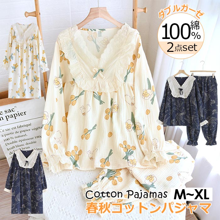可愛い部屋着セットアップ長袖長ズボン 二重ガーゼ パジャマ上下セット ダブルガーゼ 可愛い セーラー襟 春服 サラサラ