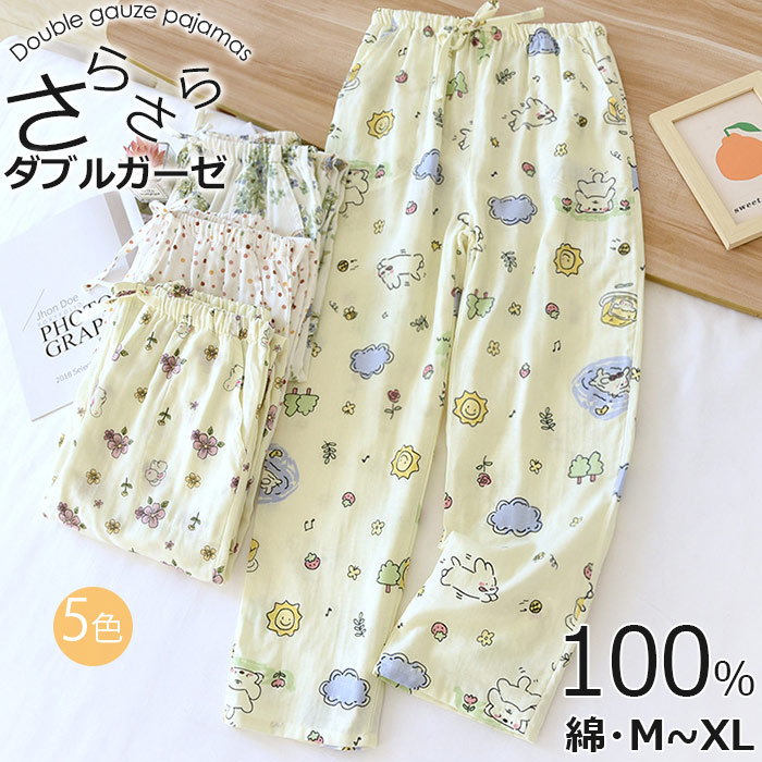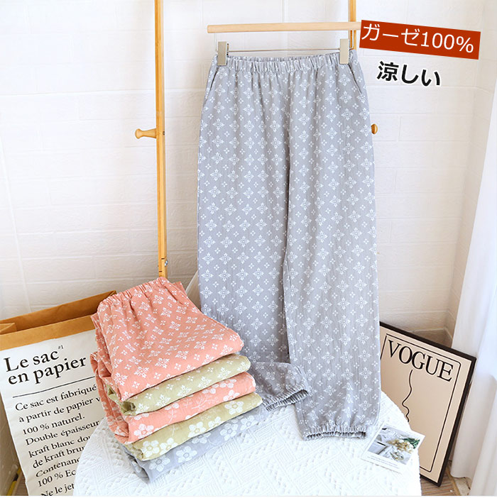 20代30代40代 おしゃれなルームウエアボトムス ロング丈 パンツだけ サラサラ 春夏用 二重ガーゼダ ブルガーゼ パジャマパン 可愛い 花柄 楽々