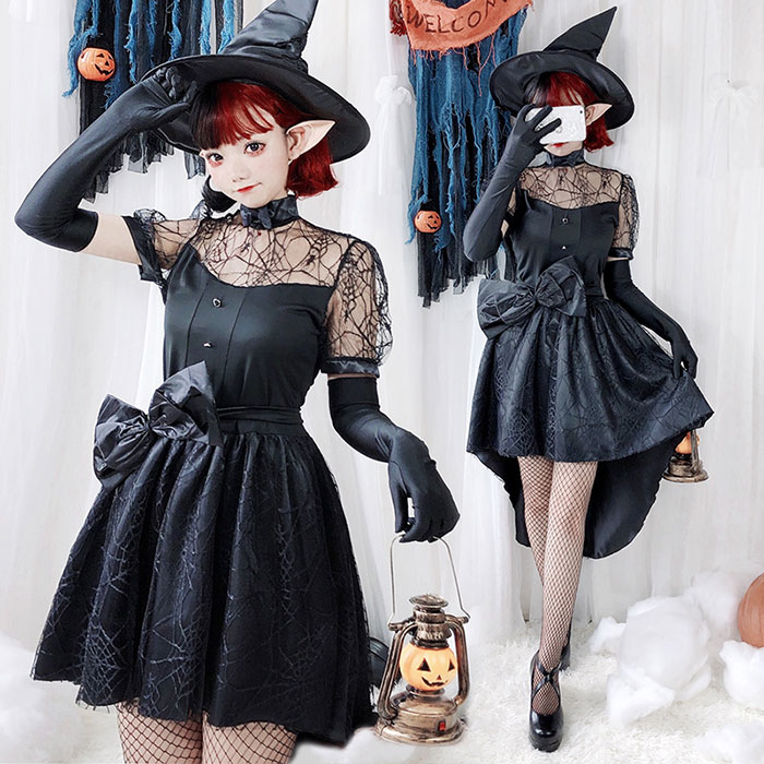 ハロウィン 魔女 コスプレ 衣装 レディース ウィッチ仮装 コスチューム 可愛い ハロウィン仮装 コスプレ衣装 ウィッチ デビル コスプレ ブラック 黒 ワンピース ミニワンピ スパイダー柄レース 巫