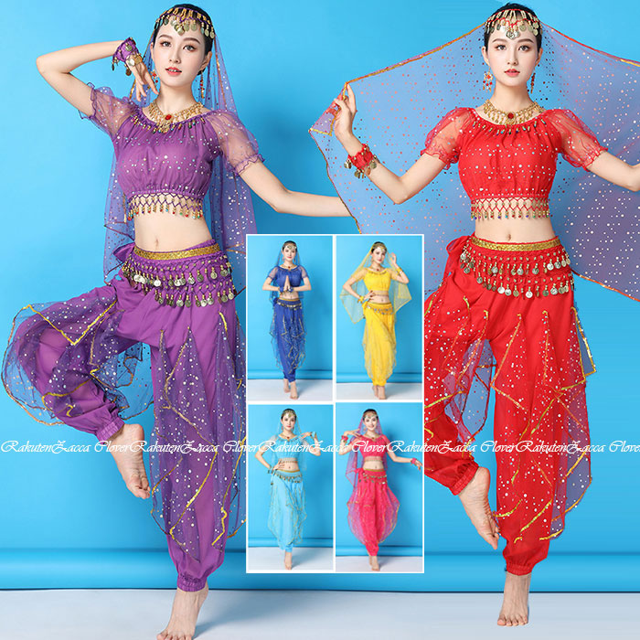 ベリーダンス 衣装 セット ハロウィン コスプレ衣装 半袖 ロング丈 パンツ コスチューム 仮装 ダンス衣装 ステージ 衣装 チョリ パンツスカート ベール ベルト セット衣装 鮮やか キラキラ 舞台