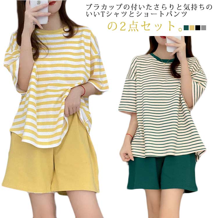 カップ付き パジャマ 半袖tシャツ ボーダー柄 ルームウェア 短パン ショートパンツ リラックスウェア 柔らかい 可愛い 春 夏