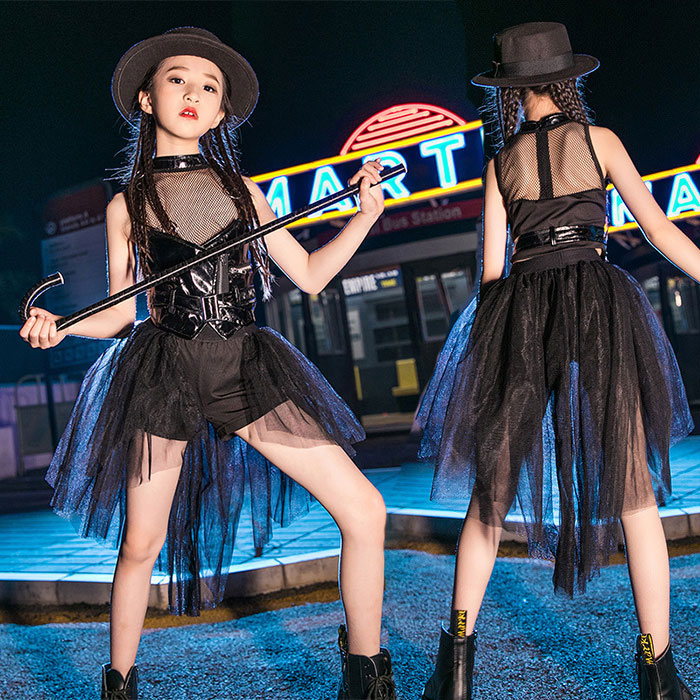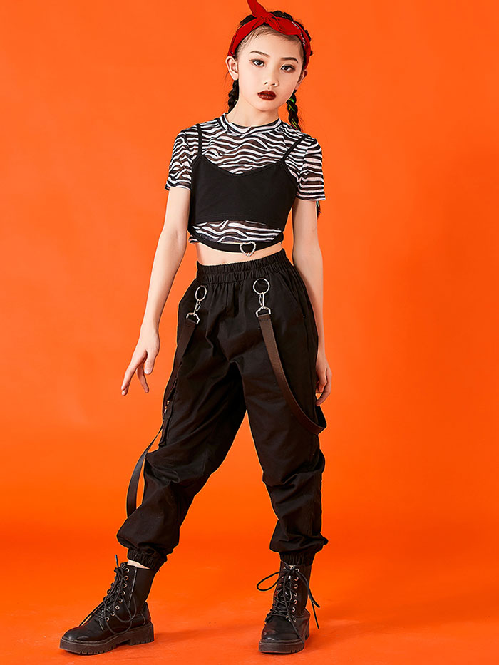 キッズ 子供用 ダンス衣装 ヒップホップ セットアップ ブラック 黒 ゼブラ柄 半袖 チュール トップス シャツ ブラックロングパンツ ダンス 発表会 子供 女の子 ジャズ ダンス 衣装 ジュニア