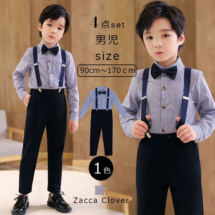 子供スーツ 男の子 サスペンダー付き 4点セット シャツ ズボン ネクタイ キッズスーツ ベビー フォーマル スーツ ブラック ストライプ 90 100 110 120 130 140 150 160