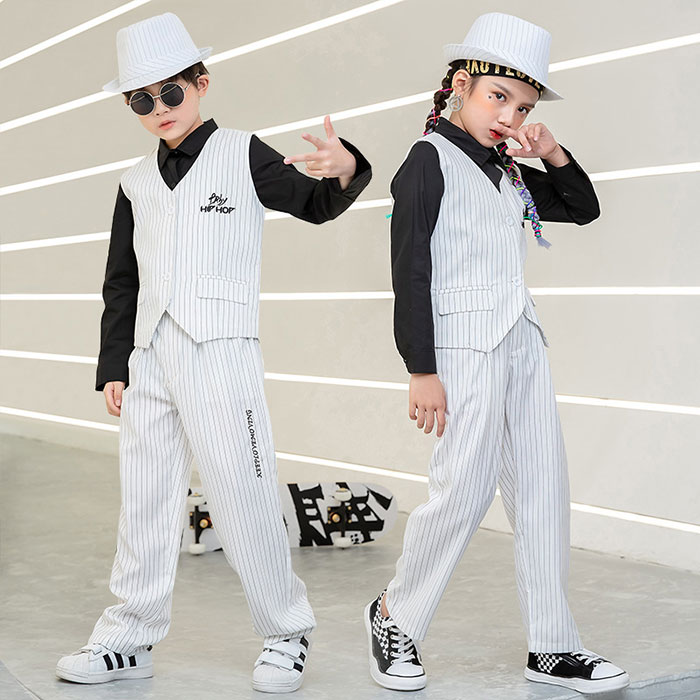 在庫処理 140cm 子供 ダンス衣装 ヒップホップ ベスト+パンツ+シャツ 3点セット ストライプ ベスト ロングパンツ パンツ ボトムス ダンス トップス hip-hop レッスン着 練習着 ダン