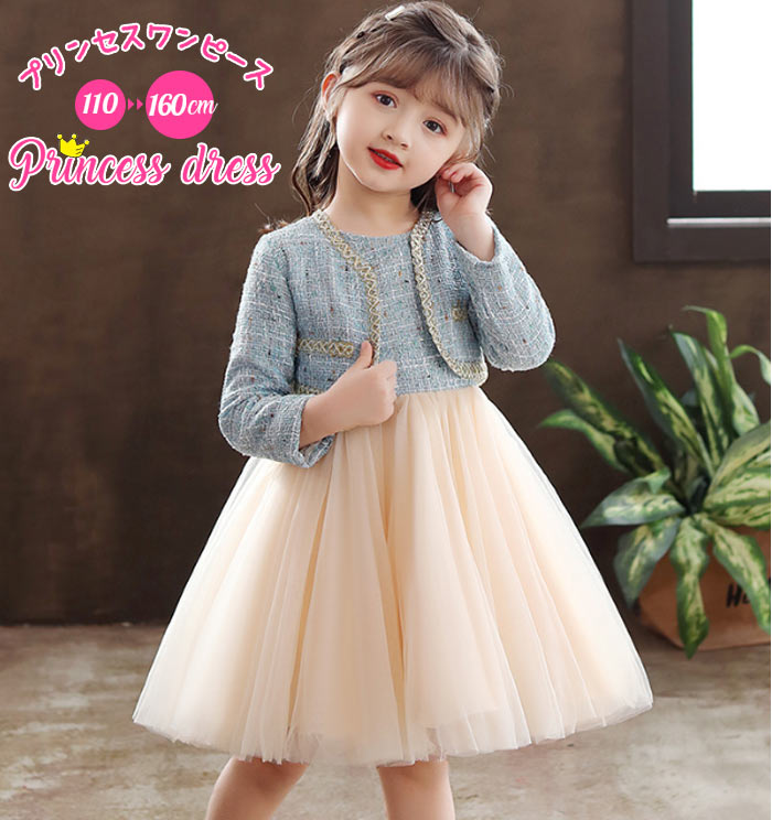 キッズドレス スーツジャケット ワンピース ドレス ひざ丈 長袖 ブルー フォーマル ピアノ 発表会 令嬢プリンセスドレス 140 150 結婚式 高校生 中学生 ひざ丈