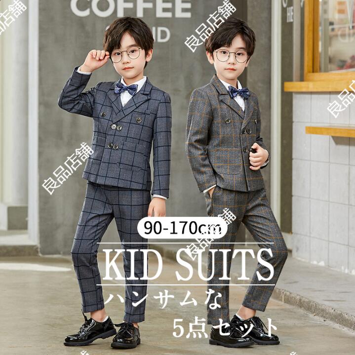 3色 5点セットアップ 無地 イギリス風 子供スーツ タキシードスーツ ジャケット+シャツ+ズボン+ネクタイ+ブローチ 90~170cm 入学式 メンズ ピアノ 司会 演奏会 防シワ加工 上下セット