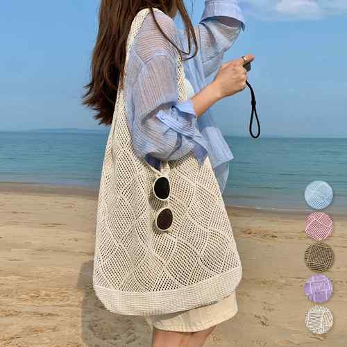 レディース おしゃれ 透かし編みバッグ 軽量 肩掛けバッグ 大容量 4対応 韓国 ニット編みかばん カジュアル 10色 折り畳みバッグ鞄夏 柔らかいシルエット レトロ風カバン無地