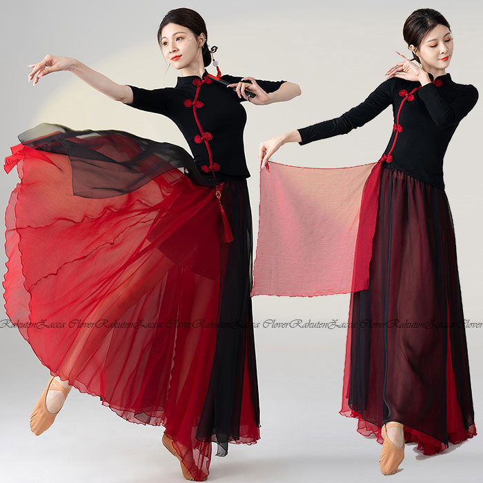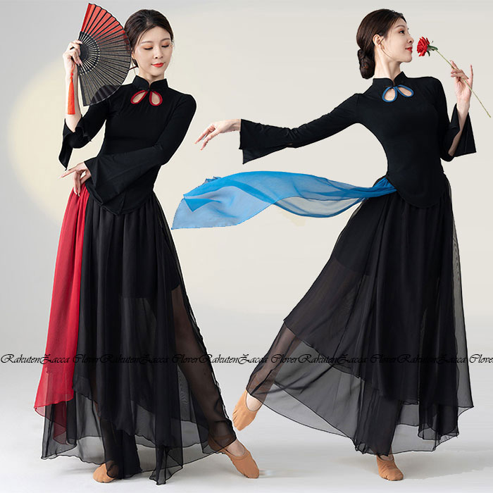 ダンス衣装 トップス パンツ チャイナドレス風 長袖 トップス ロング丈 ブラック スカート シフォン インナーパンツ付き エレガント ダンス レッスン着 セットアップ レディース 大人 ダンス衣装