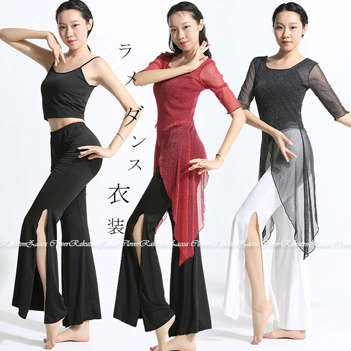 ダンス衣装 トップス パンツ ラメ入り ロング丈 メッシュ トップス スリット入り ロング丈 パンツ ストレッチパンツ 伸縮性 ダンス セットアップ レディース 大人 ダンス衣装 レッスン着 動きやす