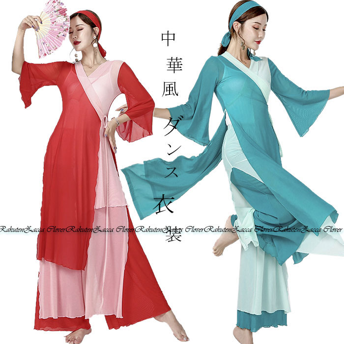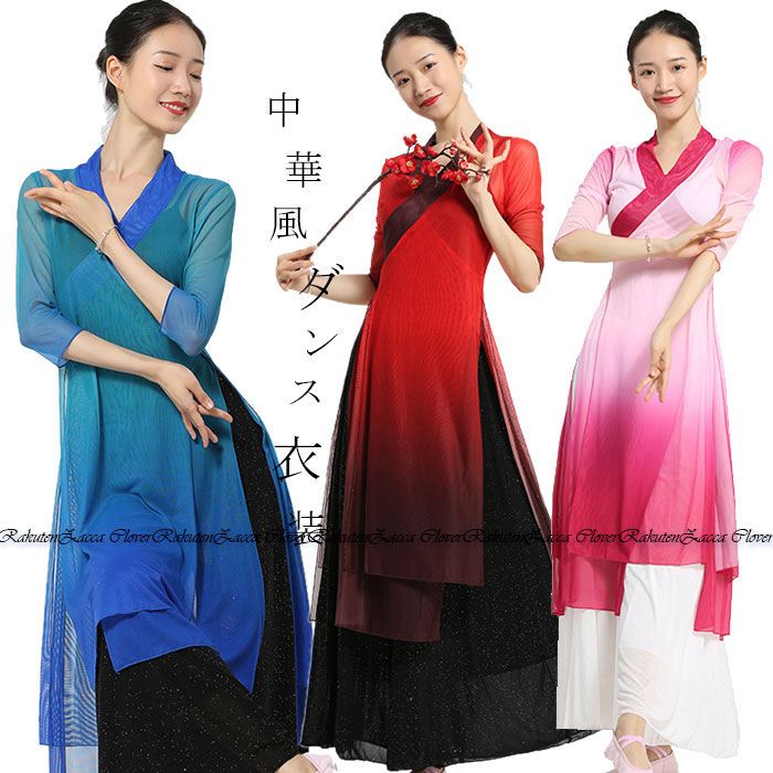 ダンス衣装 トップス パンツ チャイナ風 メッシュ グラデーション 長袖 トップス ロング丈 パンツスカート ワイドパンツ ダンス レッスン着 セットアップ レディース 大人 ダンス衣装 発表会 おし