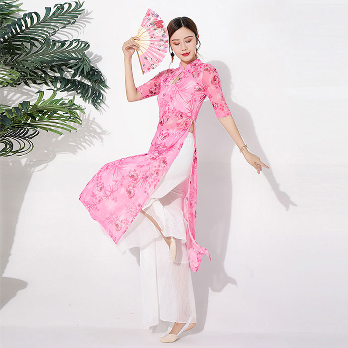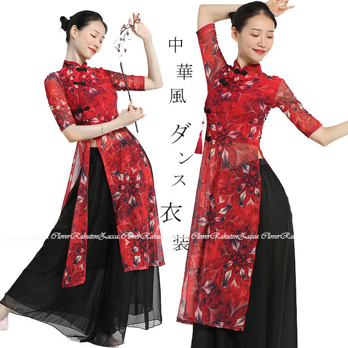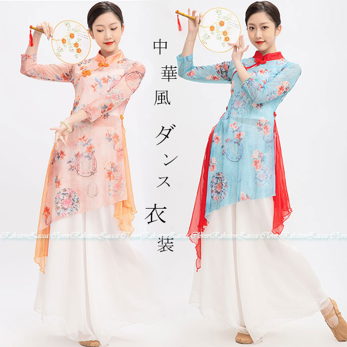 ダンス衣装 トップス パンツ チャイナドレス風 花柄プリント長袖 トップス ロング丈 シフォン パンツスカート ワイドパンツ ダンス レッスン着 セットアップレディース 大人 ダンス衣装 発表会 おし