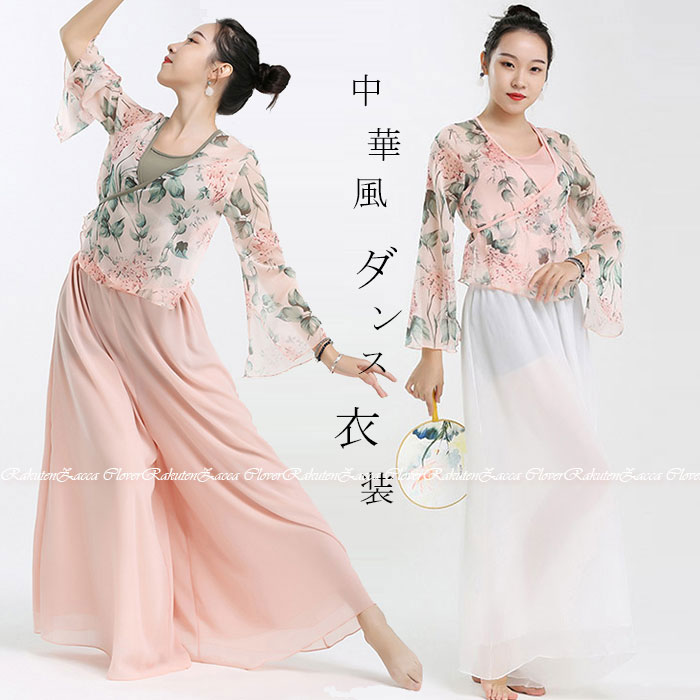 ダンス衣装 トップス パンツ チャイナ風 花柄 ロング丈 長袖 トップス ストレッチメッシュ ロング丈 パンツスカート ワイドパンツ ダンス レッスン着 セットアップ 発表会 レディース 大人 ダンス