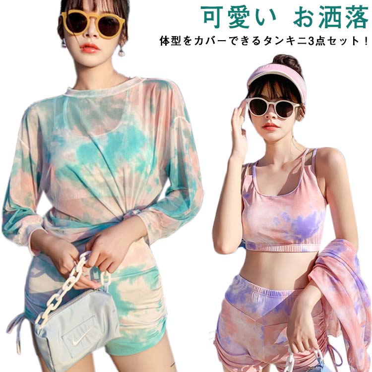 タンキニ水着 3点セット ママ 水着 タイダイ タイダイ柄スポーツ アウトドア 水泳 フィットネス水着