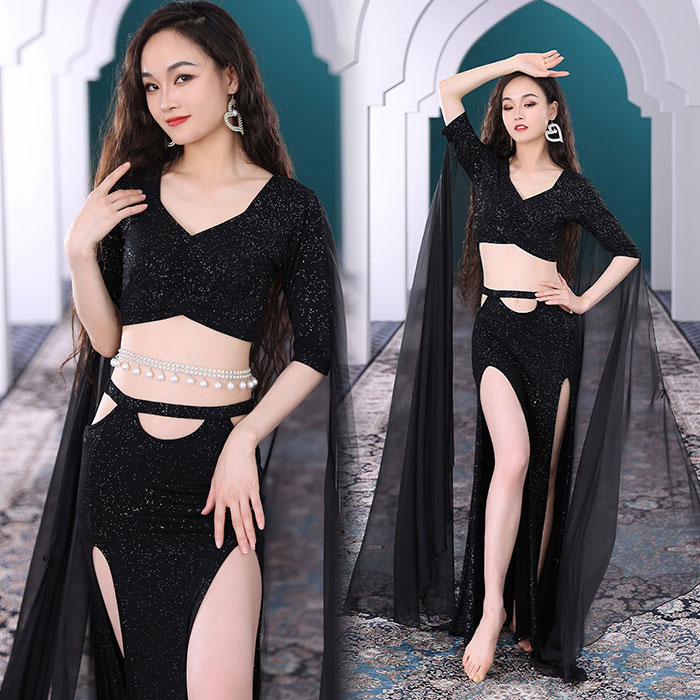 ベリーダンス衣装 セットアップ 華やか 目を引く おしゃれ ベリーダンス 衣装 ストレッチ Vネック 5分袖 スリットオーバー スカート ロング丈 星屑 キラキラ ダンス 舞台衣装 ステージ衣装 ダン
