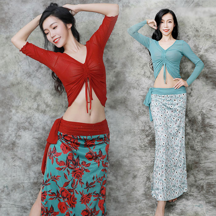 ベリーダンス 衣装 セット レッスン着 セットアップ 花柄 おしゃれ ダンス衣装 ヒップスカーフ スカート ストレッチ生地 トップス 長袖 上下セット ベリーダンス 衣装セット ダンス 発表会 5分袖