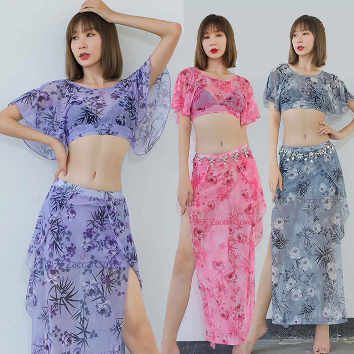 ベリーダンス 衣装 セット レッスン着 セットアップ おしゃれ 花柄 スリットオーバー スカート ロング丈 シフォン 花柄 プリント ダンス衣装 ステージ衣装 ダンス 発表会 上下セット 半袖 ロング