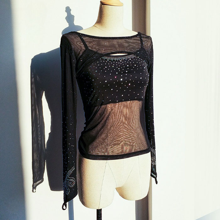 シースルー ラメー入り トップス ショット丈 半袖 長袖 ストレッチ トップス スパンコール付き ダンス 衣装 ベリーダンス レッスン着 ダンスウェア レディース ブラック ピンク