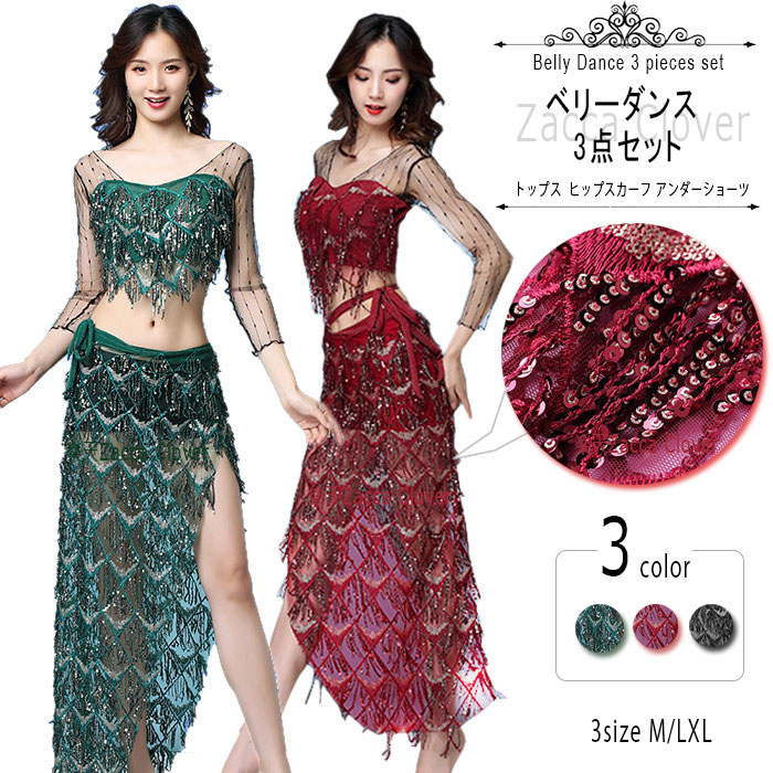 ベリーダンス 衣装 スパンコール キラキラ おしゃれ 発表会 衣装 メッシュ生地 透け感 セクシー ベリーダンス衣装 伸縮性生地 長袖 トップス マーメイド ヒップスカーフスカート ロング丈 ベリーダ