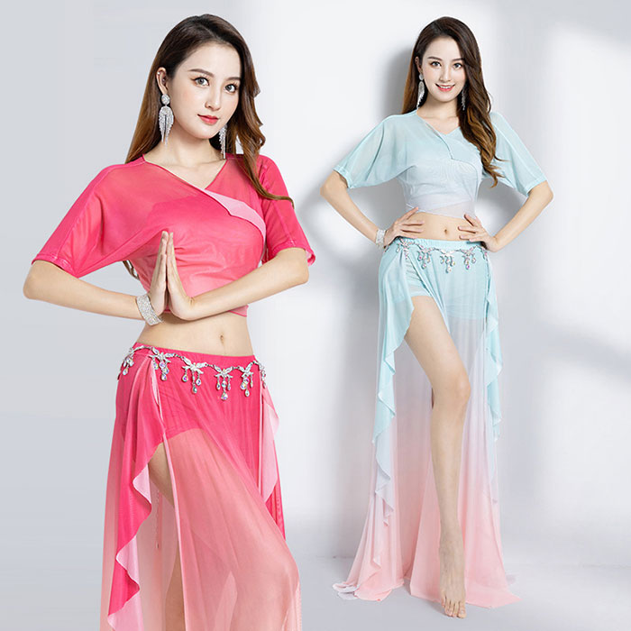 ベリーダンス衣装 セット衣装 グラデーション メッシュ ベリーダンス 衣装セット インナーパンツ付き ロング丈 スカート 半袖 Vネック トップス おしゃれ ベリーダンス 衣装 ダンス レッスン着 舞