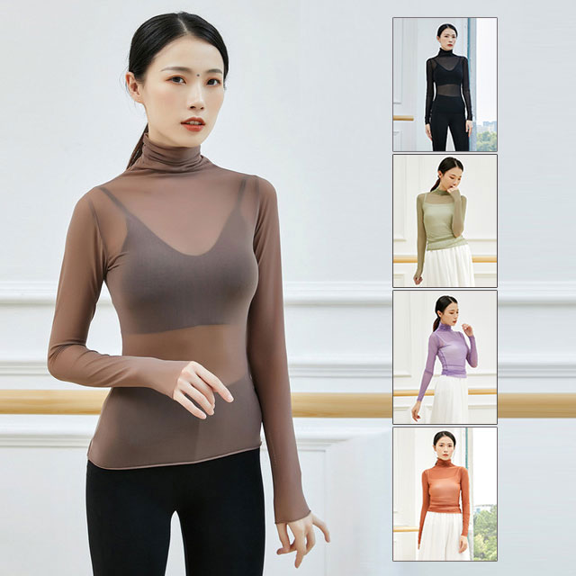 バレエトップス ハイネック レディース 大人 バレエウエア メッシュ チュール 長袖 大人 レッスン着 レッスンウエア シースルー 動きやすい伸縮生地 美シルエット おしゃれ ダンス トップス社交ダン