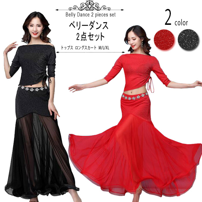 ベリーダンス衣装 トップスとスカート 2点セット ラメ入りキラキラ ダンス衣装 ステージ衣装 舞台衣装 ダンス 発表会 レディースファッション コスチューム