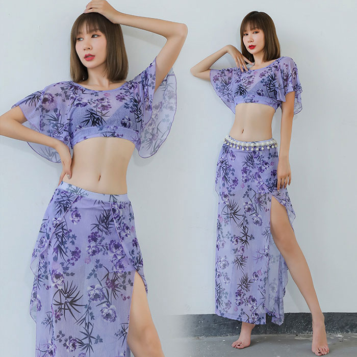 ベリーダンス 衣装 セット レッスン着 セットアップ おしゃれ 花柄 スリットオーバー スカート ロング丈 シフォン 花柄 プリント ダンス衣装 ステージ衣装 ダンス 発表会 上下セット 半袖 ロング