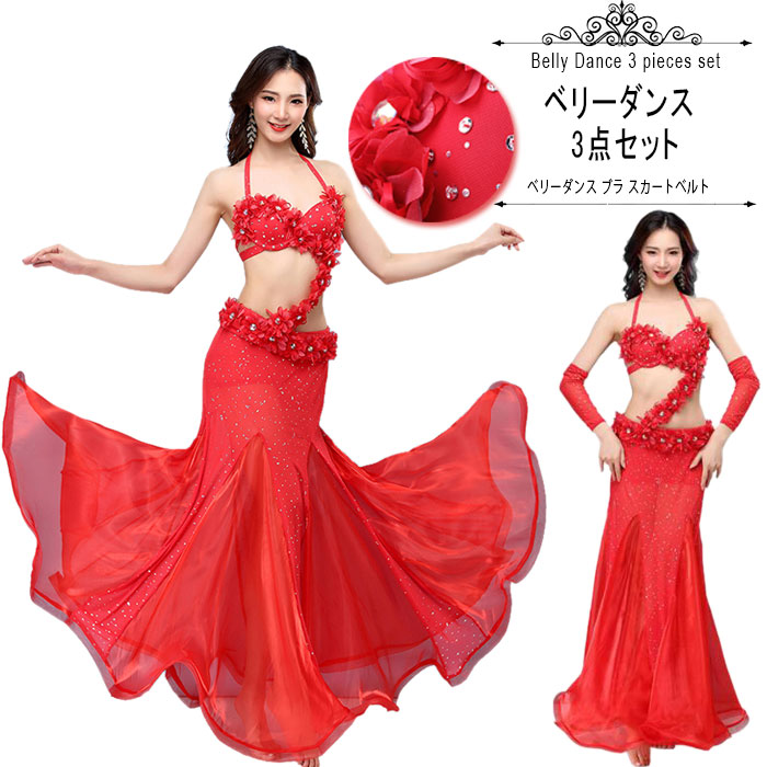 インナーパンツ付き ベリーダンス セット衣装 スパンコール ダンス衣装 レッドスポーツ アウトドア 体操 ダンス ベリーダンス 衣装セット