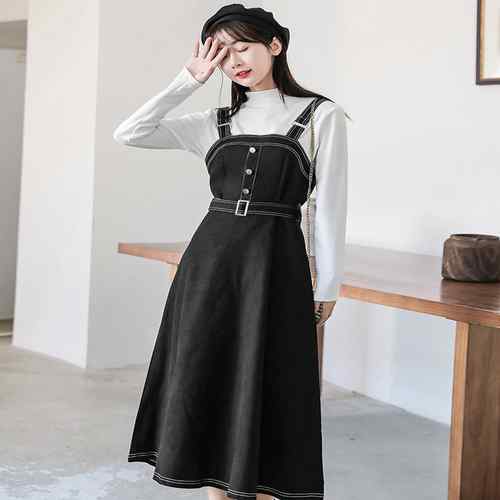 ベルト付き 配色ステッチ Aラインワンピース レディース ハイウエスト ジャンスカワンピース 重ね着 サロペットスカート 無地オールインワン 着やせロングワンピ ウエストマーク韓国