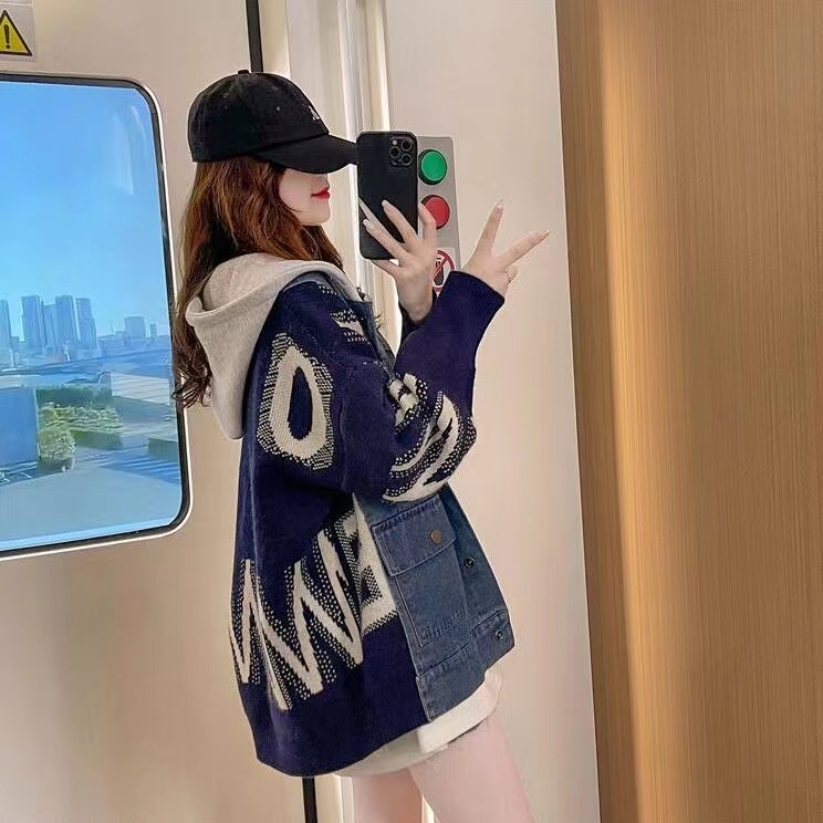 パーカー ニット レディース アウター 春 秋 冬 カーディガン 切り替え 重ね着風 デニムレディースファッション トップス パーカー