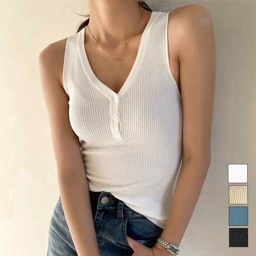 レディーストップス 韓国 ノースリーブ肌着 フィット 無地 ボタン ベスト サマーニット お洒落 大人女子 セクシー 新作ニットトップス 可愛い見せインナー 人気 着やせタンク