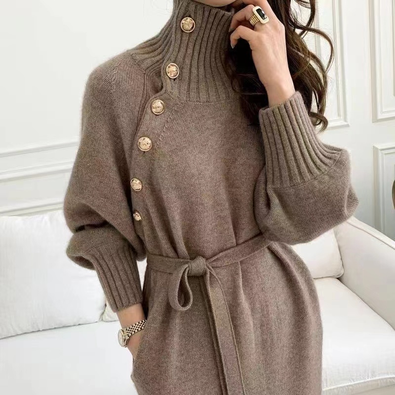 ロングワンピース ニットワンピ レディース 秋冬 ゆったり ベルト 長袖 タイトネック 可愛い 厚手 セーター ニット ベージュ 杏色 ブラック 2 152