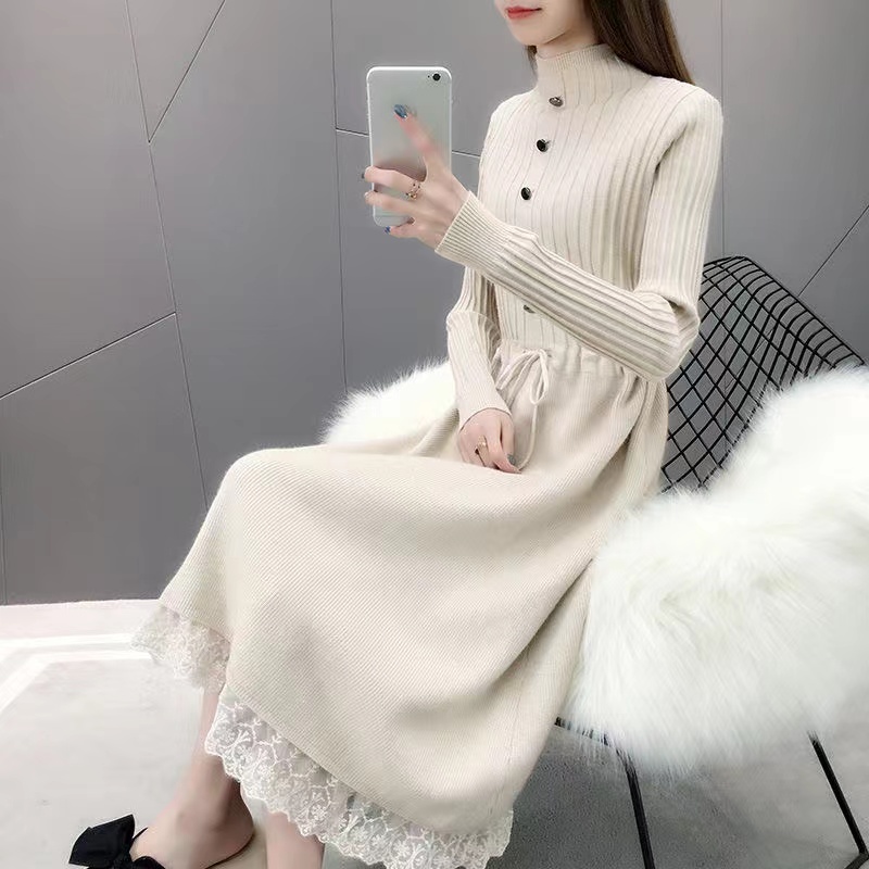 ロングワンピース ニットワンピ レディース 秋冬 セーター ニット レース 通勤 タイトネック 長袖 可愛い ベージュ ブルー レッド ブラック S M L XL 2XL 3XL SLWA150