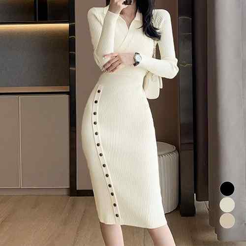 韓国ファッション ミディ丈ワンピース セクシーリブニット きれいめタイトワンピースVネック ボディコンワンピース 着やせ ウエストマーク秋服 ニットワンピ細見え 長袖ワンピース無地