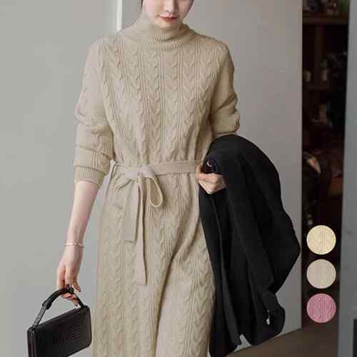 レディース タートルネックワンピース 暖かい ニットドレス 体型カバー ウエストマーク きれいめ 着やせロングワンピース ゆったりワンピース 細見えロングニット 華奢見えニット上品