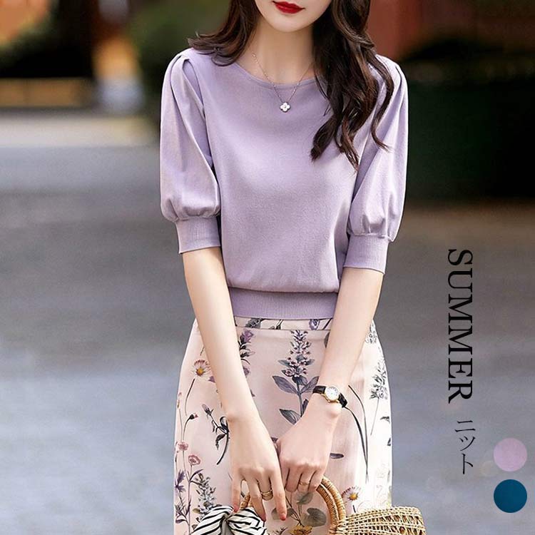 ふわりとボリュームのある袖でフェミニンに仕上げたバルーン袖サマーニット プルオーバー 夏ニット 半袖ニット 半袖シャツ 切り替え 可愛い シンプル オシャレ