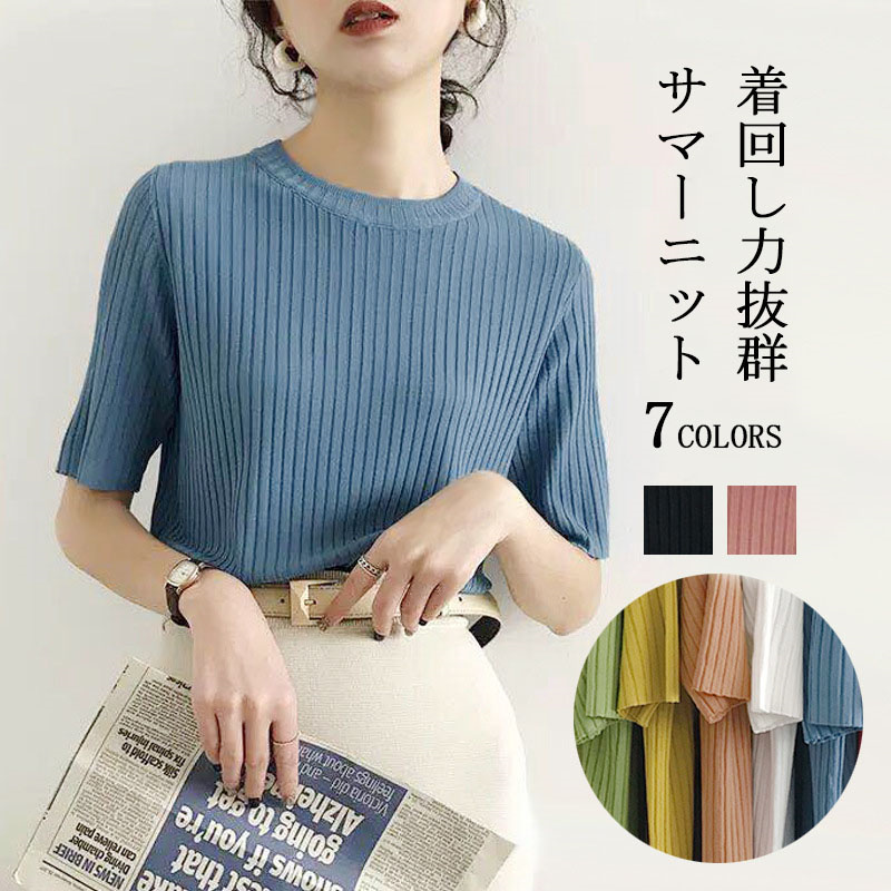 着回し力抜群サマーニット 五分袖 リブ カラバリー 重ね着 着心地がいい ひんやり 涼しい 可愛い 着痩せ 20代 30代 40代 ルームウェア