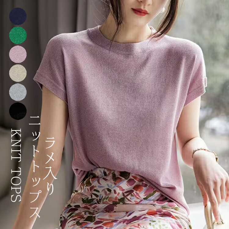ラメ入り半袖サマーニット フレンチスリーブ 着心地がいい きれいめ 通勤 大人 可愛い カジュアル風 おしゃれ 半袖Tシャツ イロチ買いたくなるニット