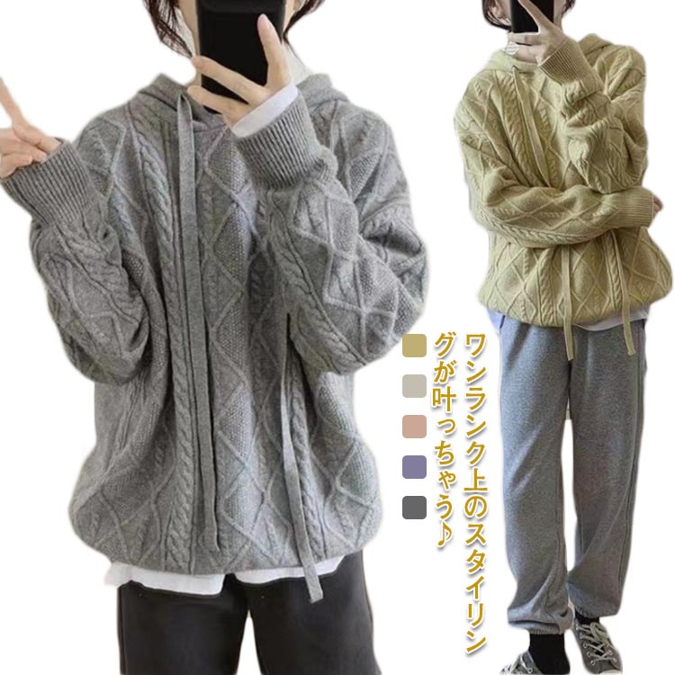 大人可愛いケーブル編みフーディーニット ドロップショルダー ニットパーカーレディースファッション トップス ニット セーター ニットパーカー